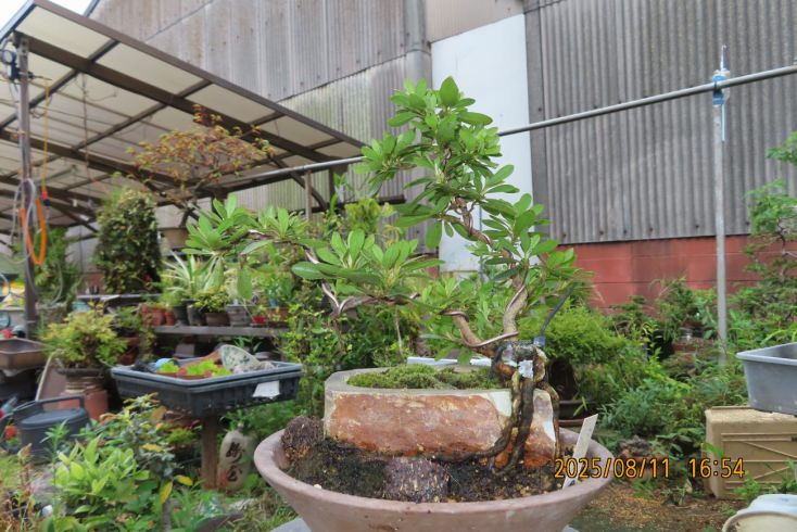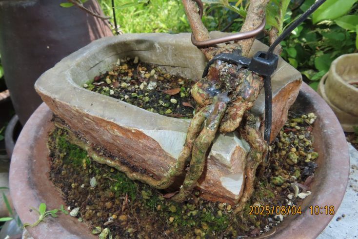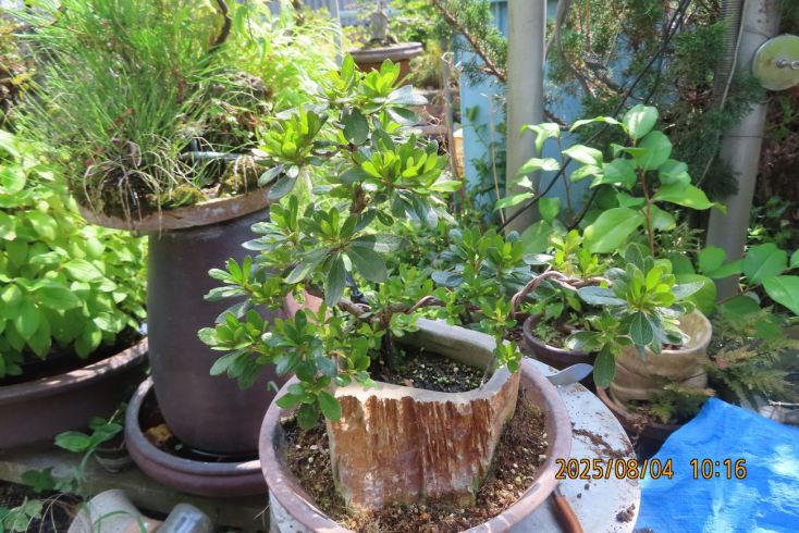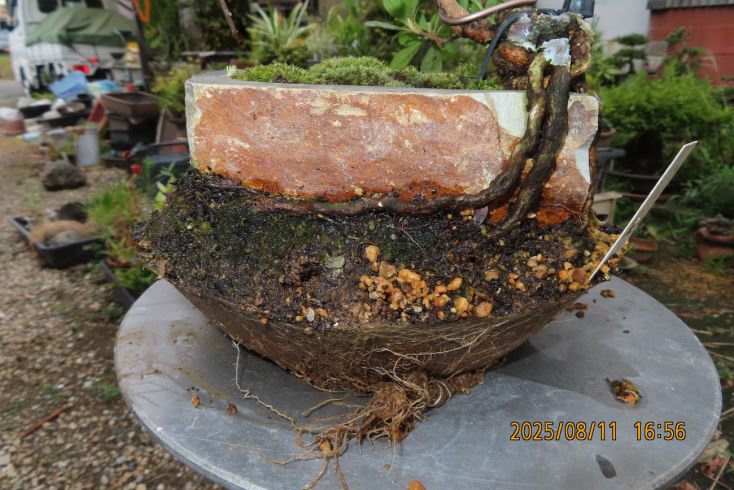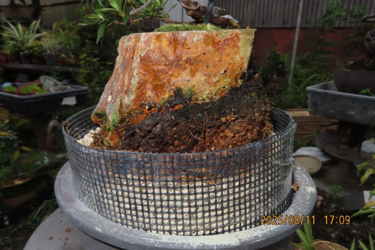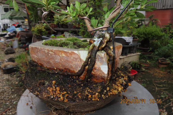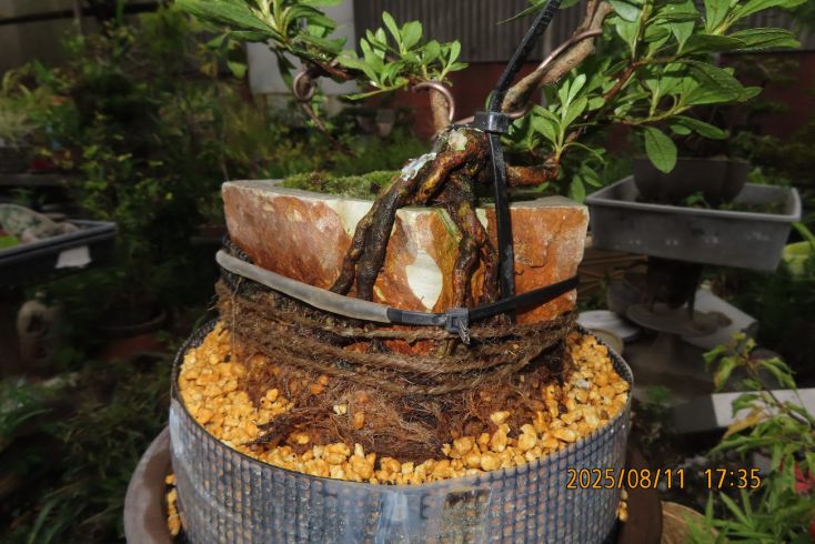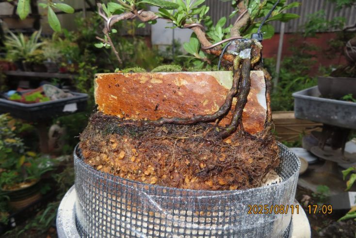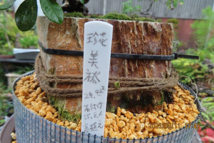 名札を付けて植え替え完了しました この樹の完成目標は 現在は我家の棚から巣立って行きありませんが 2019年(令和元年)秋のさつき盆栽と山野草展に出品した 空の下さつき出品作品「赤晃山石付け」作品参照 赤晃山石付けのように 根が石を持ち上げた作品を作るのが目標 現在85才の空の下さつき目標達生できるかな・・・・ 2025年 8月25日更新 |