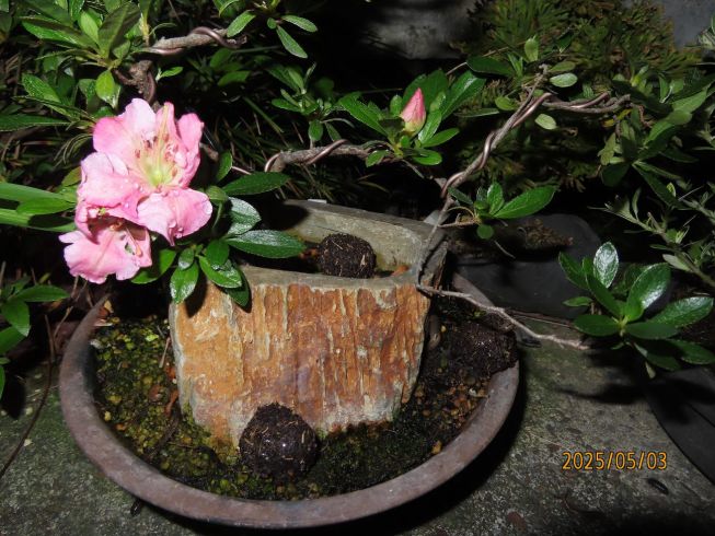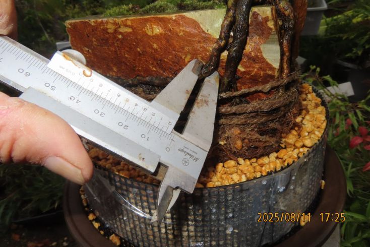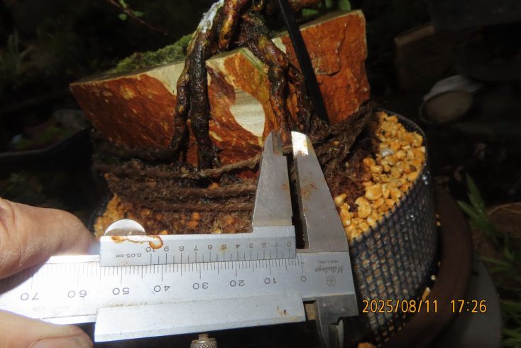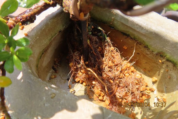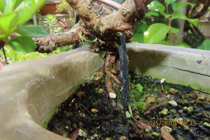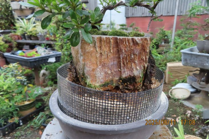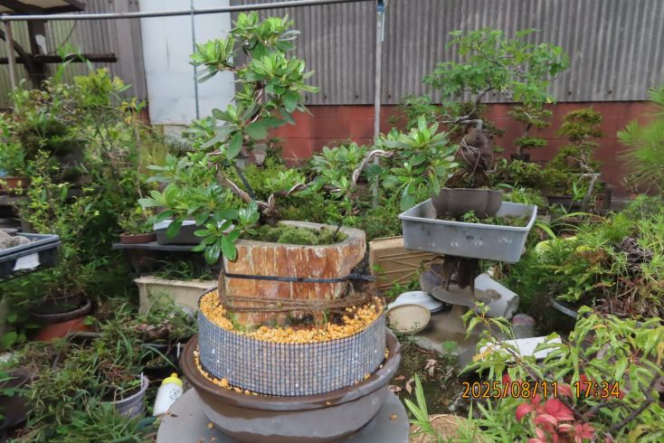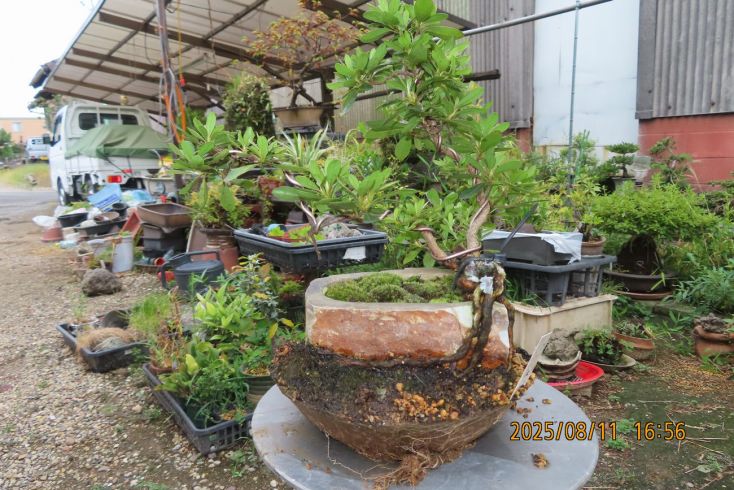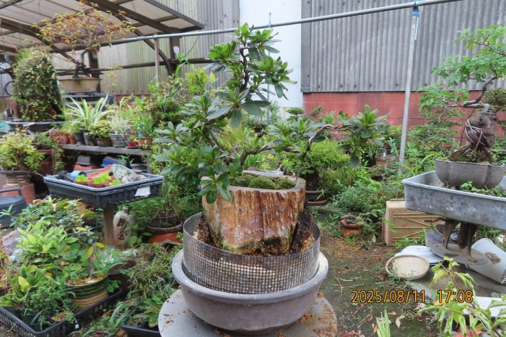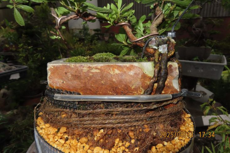 名札を付けて植え替え完了しました この樹の完成目標は 現在は我家の棚から巣立って行きありませんが 2019年(令和元年)秋のさつき盆栽と山野草展に出品した 空の下さつき出品作品「赤晃山石付け」作品参照 赤晃山石付けのように 根が石を持ち上げた作品を作るのが目標 現在85才の空の下さつき目標達生できるかな・・・・ 2025年 8月25日更新 |