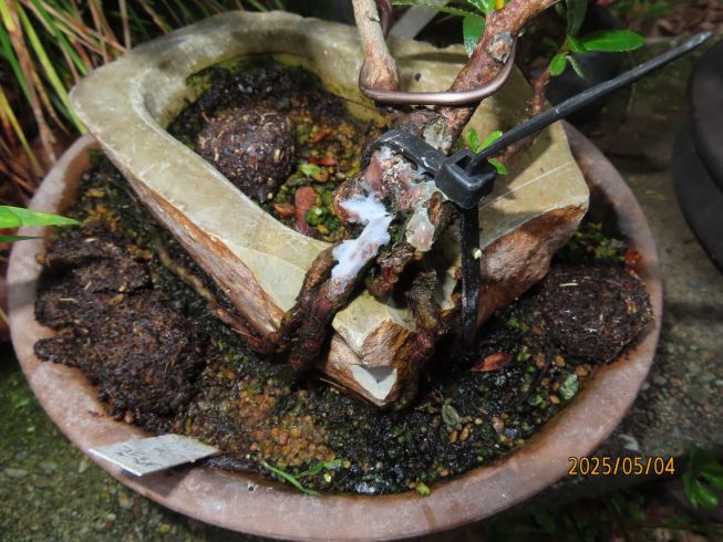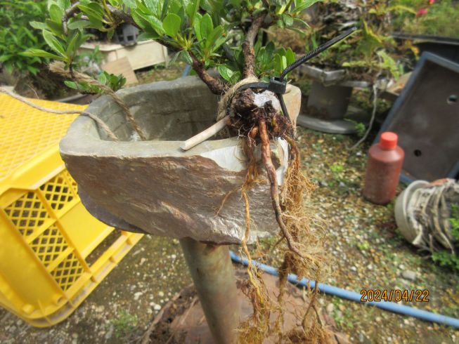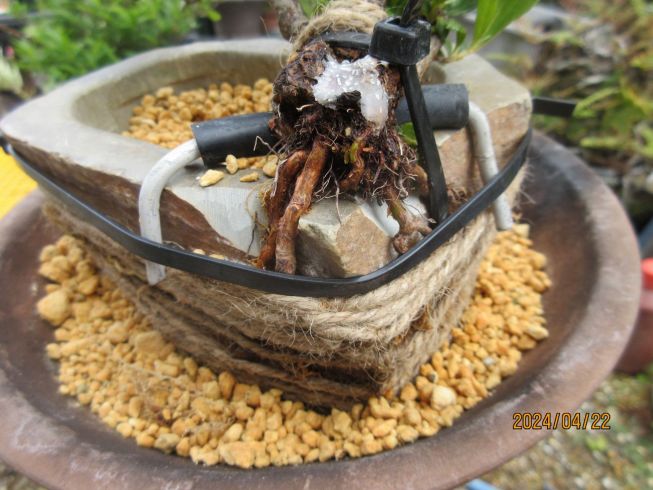 石鉢の角を削り 鉢底穴と外部に根をまたがせて 結束バンドで固定 |