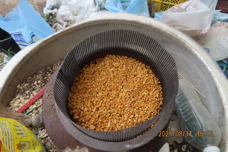 2025年 8月 4日 培養土の鹿沼土水道圧で洗い流す |