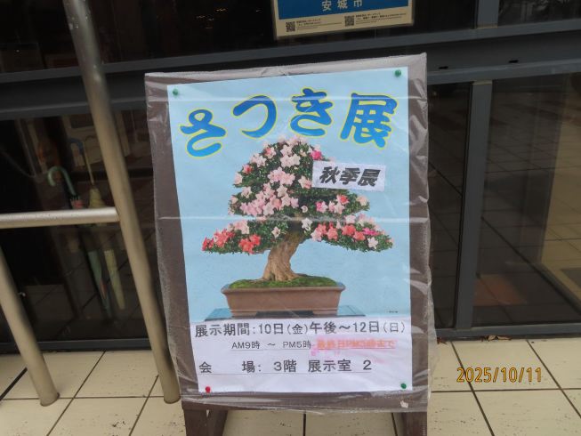 碧信ギャラクシープラザ入り口に 安城皐月同好会のさつき展案内板 |