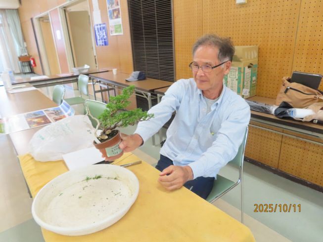 市民会館へ移動 柴田さん真柏の整枝作業をして見えました |